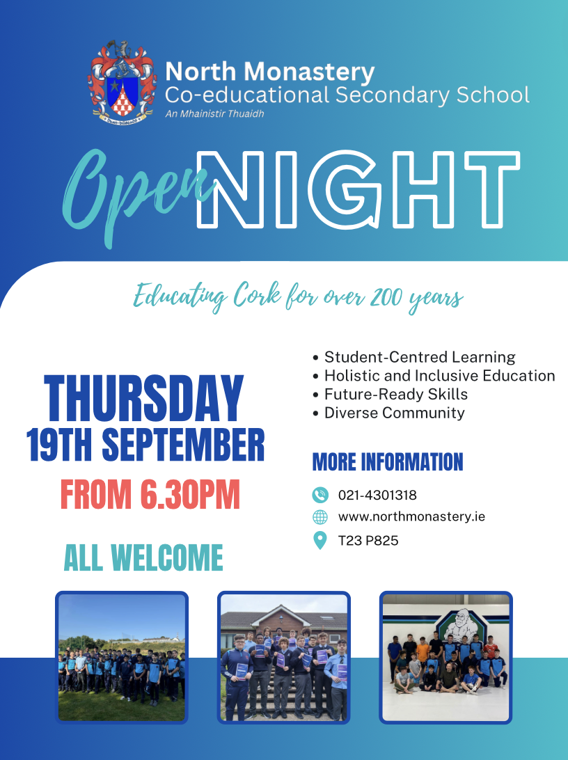 The 2024 North Monastery Co-educational Secondary School Open Night will take place on Thursday, September 19th.